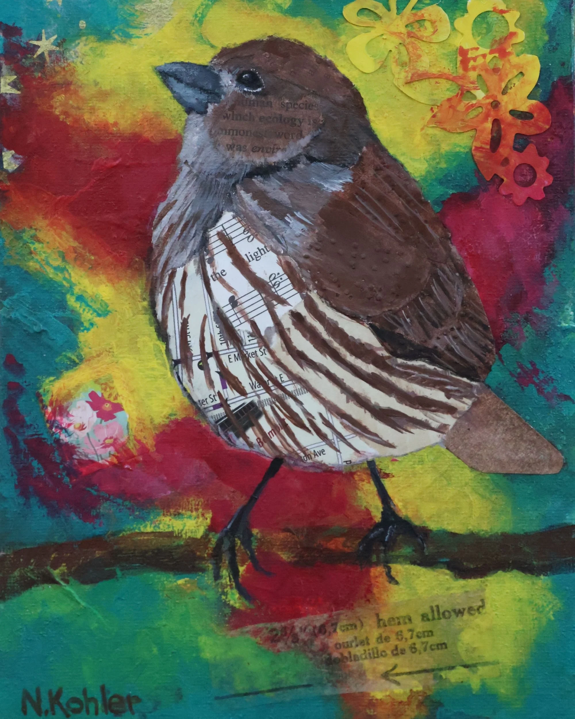 Finch Friend - Mixed Media Collage on Canvas Board - 8" x 6"
