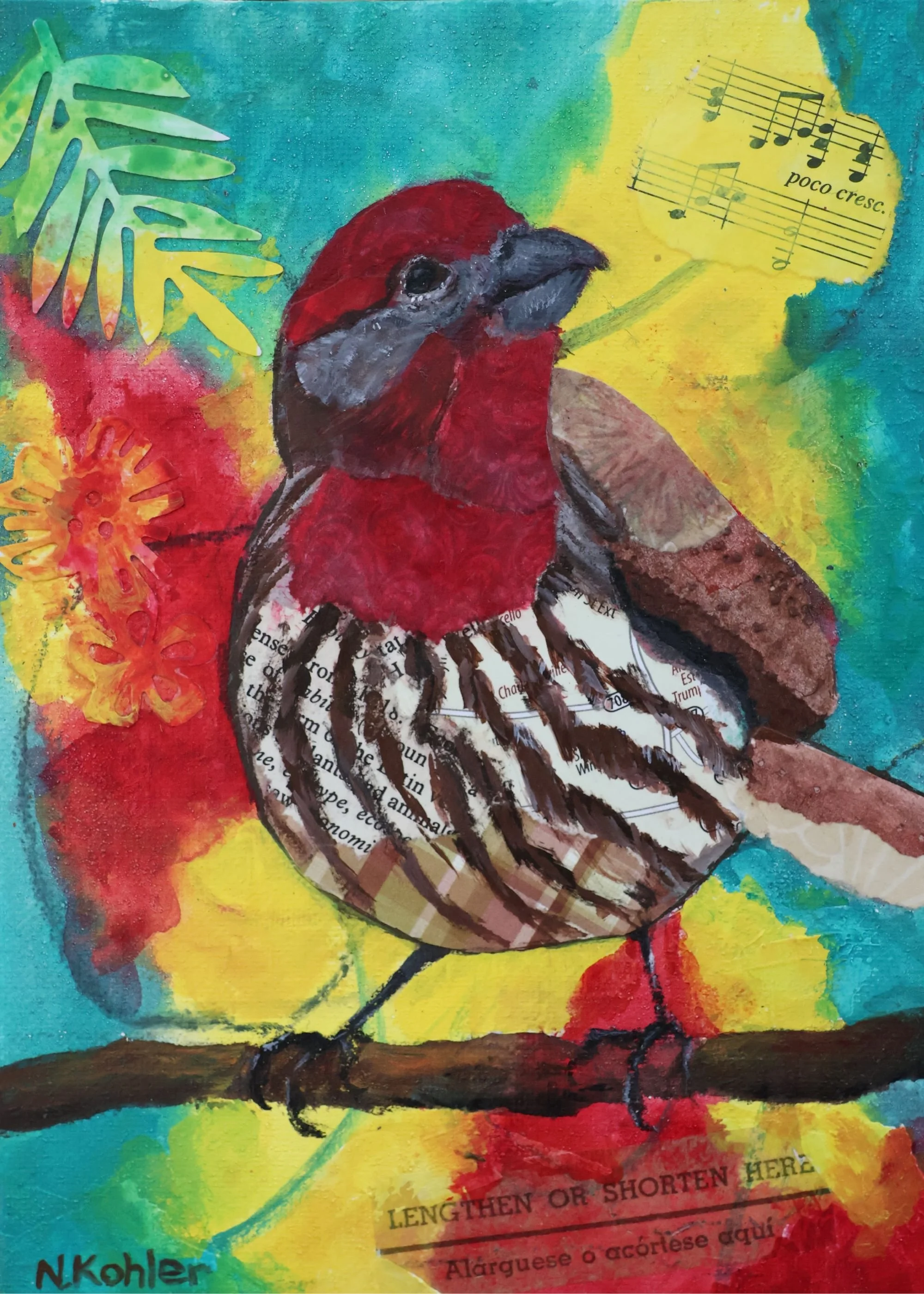 Finch Song - Mixed Media Collage on Canvas Board- 8" x 6"
